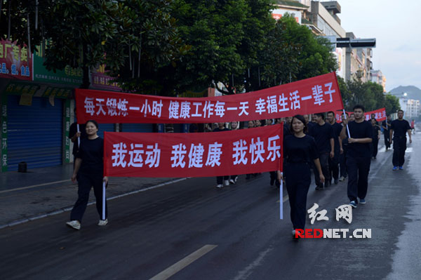 红网江永8月5日讯(通讯员 黄海)8月5日,湖南江永县公安局在县城永明大道开展“迎接全民健身日,公安民警健步走”活动,喜迎第四个全国“全民健身日”的到来。当日清晨6时许,江永县全局近百名机关民警在知青广场列队集合,统一着警用T恤和作训裤,警容严整、精神抖擞。随着指挥员一声令下,长长的队伍迈着稳健的步子快速向前进发。