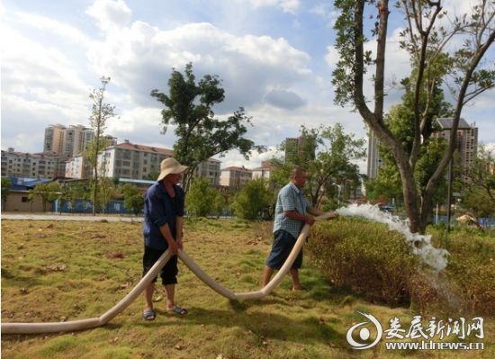 红网娄底站8月15日讯(通讯员 聂胜华)6月份以来,持续的高温天气,使涟水河风光带尽显旱情。为了抗旱护绿,涟水河风光带管理办公室在浇灌系统不能正常使用的情况下,购买了8台水泵。管理处所有工作人员分成两班,冒着酷暑,全部投身抗旱一线,每天从早上5点钟一直持续到到晚上12点多,对风光带内的植物进行浇灌,确保20多万平方米的植被和2万多棵苗木喝饱水。他们用辛勤的汗水,换来风光带的绿意盎然,为广大市民在盛夏提供了一个纳荫乘凉的好去处。