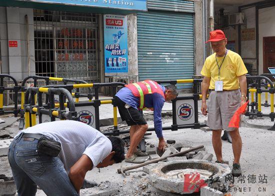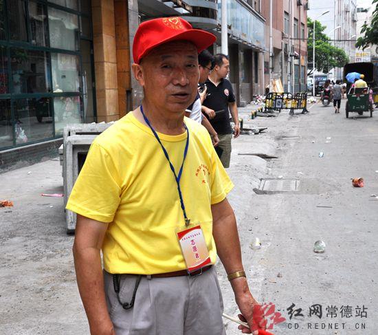 一双迷彩军用胶鞋,一条七分裤,搭着一件标有“幸福常德、你我共建”字样的志愿者衣服,头戴一顶小红帽,手上还拿着一枚小红旗。这就是正在上班的古稀年纪的志愿者顾家锡,“这条路预计11天的时间修好。”