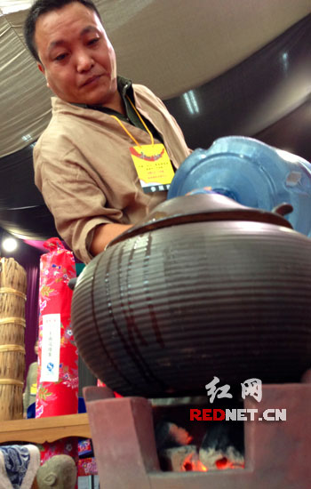 (茶博会上,参展企业现场煮黑茶。)