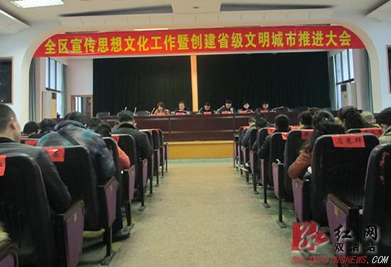 红网双清站3月8日讯(分站记者 赵绍君 张雪珊) 3月6日,全区宣传思想文化工作暨创建省级文明城市推进大会召开。会议传达贯彻中央、省、市宣传思想工作会议精神,回顾总结五年来全区宣传思想文化工作,研究部署下阶段工作,讲评、推进省级文明城市创建工作。区委书记郑再堂作重要讲话。区委副书记邓涛主持会议并讲评创文工作。区委常委、宣传部长禹会前作宣传思想文化工作报告。副区长李平宣读表彰决定。区领导夏红波、毛更鑫出席会议。会议对先进单位和个人进行表彰。各乡镇办、区直机关向区委递交责任状。