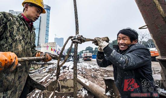 三等奖《为了一座桥》之三:2014年2月9日一早,冰雪覆盖,打桩机班长聂明河师傅带着女婿紧张调试机器。夏斌摄