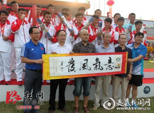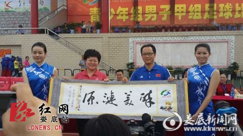 红网娄底站8月28日讯(分站记者 李响炮 谭卫丰)“天道酬勤”、“意气风发”……一幅幅或勉励或警示的书法作品送到了省运会金牌得主手中。8月27日下午,由娄底本土书法名家创作的24幅作品,送到了参加省运会青少年组男子甲组足球赛的娄底代表队员手中。8月27日,在娄底市涟源一中举行的湖南省第12届运动会青少年组男子甲组足球赛上,长沙代表队战胜株洲代表队,获得第一名,娄底以1:0小胜郴州,获得第三名,创下了娄底市参加省级以上足球比赛的历史最好成绩。