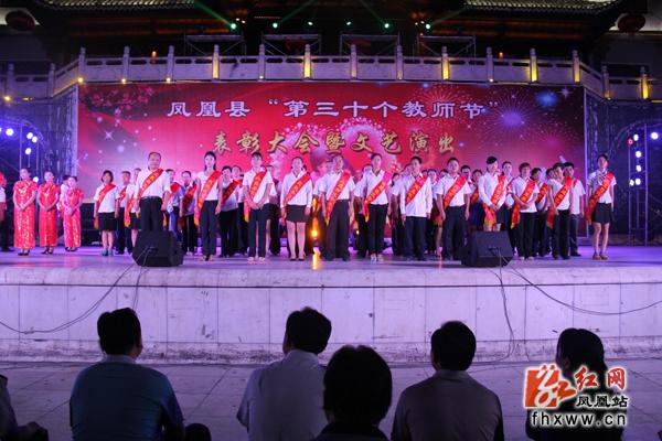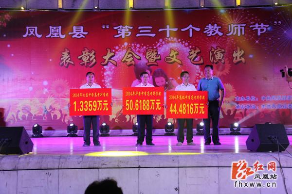 红网凤凰站9月10日讯(分站记者 麻正规 通讯员 吴玉辉 龙丽君 王华 卢志富) 9月9日晚,在第30个教师节来临前夕,凤凰县庆祝教师节表彰大会暨文艺汇演活动在县文化广场隆重举行。在活动中,该县对2013年至2014年度教育教学工作先进单位及个人进行了隆重表彰,共奖励奖金315.7929万元。
