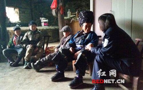 民警在村民家中使用苗语与老人讲解毒品预防知识
