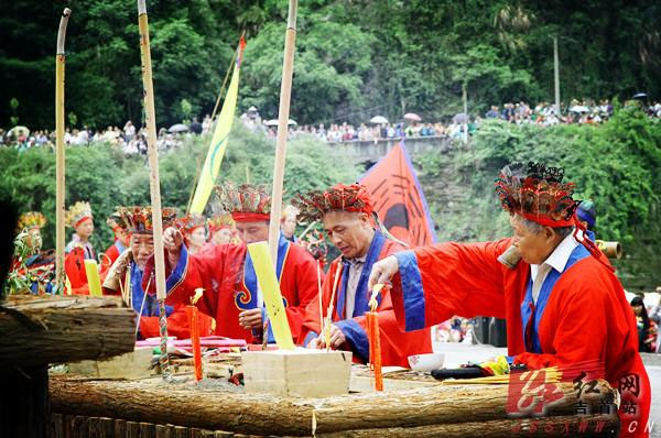 “一拜天,求天保佑我们苗家风调雨顺;二拜地,求地神保佑我们苗家五谷丰登;三拜神佛,求神佛保佑我们苗家四季平安……”在巴代庄严、肃穆的祭祀中,仿佛让人们回到那久远的年代,感受到苗族祖源与迁徙的历史,苗家人与大自然作斗争的生产活动中,创造并传承下来的精神文化,苗家先祖的灵魂似乎从冥冥的时空中穿越而至。现场上千名观众情不自禁的与巴代一起举起双手祭拜先祖,一起祈求来年风调雨顺。“来了,来了,我们的祖先来了,祖先神灵有求必应……”巴代们继续手摇法铃、口诵经文,身后的苗家汉子高举法旗,挥舞的越发有力,各乡镇苗族同胞鱼贯上前,上香跪拜先祖英烈。混着鞭炮、香火的冉冉青烟中,先祖的灵魂伴随着雄浑的号角、激昂的鼓点,在悠扬地歌谣里又悄然离去,仪式落幕。