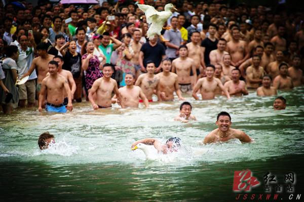 在今天的“四月八“节日里,还举行了抢鸭子比赛。鸭子还未投入河中,早已按捺不住的汉子们纷纷跳进水中,各显本领,“捉到鸭子走,夜头搞餐酒。”鸭子在人们的哄笑声中惊起,四处乱窜,鸭子与赶鸭子的人混在一处。别看鸭子在岸上笨拙,一下到水里可大不一样,一会潜入水中,一会钻出水面,没有经验的人往往被弄得昏头转向。刚一靠近,就惊得鸭子拼命拍打翅膀,不但捉不到鸭子,反而被溅得满脸是水,引得岸上的人一阵哈哈大笑。