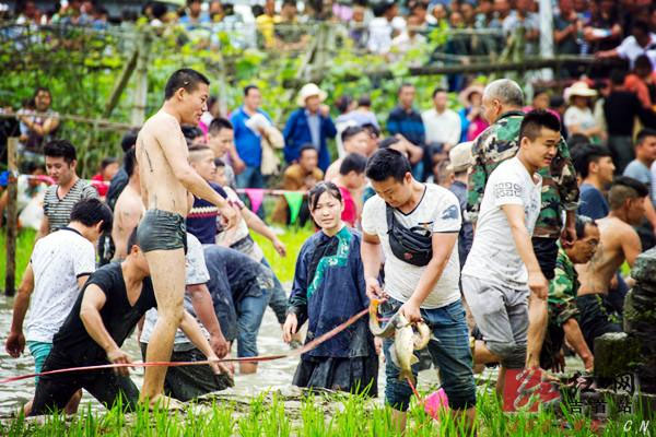 如果说抓鸭子还需要战略和体力的话,那摸鱼比赛门槛就低了很多,男女老少齐齐“宽衣解带”,近百人挤在一丘大水田里“浑水摸鱼”,丝毫不在意沾满全身的泥巴,“哇,你看那个人好厉害又摸到一条大鱼。”一旦抓住鱼后,人群中的惊叹勾起更多人继续“战斗”的欲望,而年龄小的孩子们抢不赢大人,干脆在田中打起滚来,又是惹来围观群众笑声连连。除此之外,节日当天还设置了趣味猜灯谜、跳花、诗词朗诵、民族文展示、苗家长龙宴等多项活动供人们娱乐。“这里的活动都很有意思,苗族真是一个神秘又浪漫的民族。”广州游客王小东说,这一天近距离的体验,让他加深了对湘西的认识,以后会带更多的朋友来吉首感受这里独特的文化。