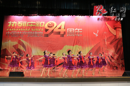 在活动的第二部分文艺汇演中,街道8个村(社区)支部选送了特色的文艺节目,为即将到来的党的生日送上真挚祝福。活泼可爱的孩子拿起手鼓,欢快的舞姿为我们带来了《舞起幸福鼓》;阿姨们则拿起了快板,为我们把《国策民生大事情》给道出来,把《环境卫生靠大家》说进大家的心坎;穿着各式军装的文艺爱好者为我们带来《我们的队伍向太阳》,送上一场中国军装的历史变迁;更有激扬生动的二胡《赛马》表演,让我们仿佛置身于绿色大草原;现代京剧《沙家浜》《智斗》的精彩片段为我们带来别具一格的历史回顾;小品《营养在汤里》让大家明白社会的和谐离不开家庭的和谐。最后在《伟大的祖国更精彩》整齐划一的舞蹈表演中结束了此次庆祝建党94周年党员大会的文艺汇演。整场演出生动地反映了月亮岛街道这两年来取得的可喜变化,抒发了老百姓永远跟党走的坚定信念,表达了群众文艺生活越来越丰富、与国家日渐昌盛密不可分的群众心愿。