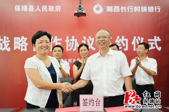 保靖县委副书记、县长杨志慧与湘西长行村镇银行董事长高峰分别代表双方签约 张承印 摄