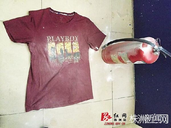 在被民警追捕时,方强将灭火器里的干粉喷向民警。图为灭火器及民警被喷得发白的衣服。(记者肖蓉摄)