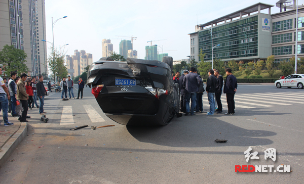 红网株洲11月3日讯(通讯员 许琳) 11月2日中午,在株洲市天元区明日路上,两台小车在经过十字路口时,都未减速继而相撞。其中,黑色丰田小车还翻了个底朝天。