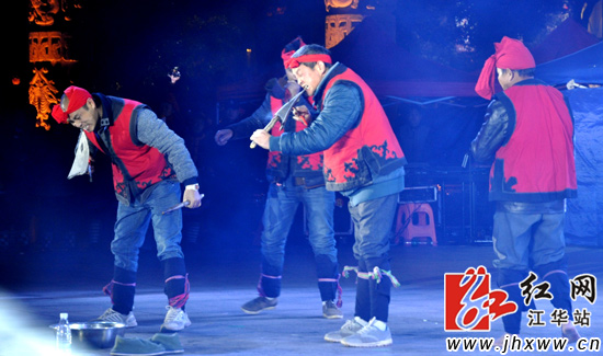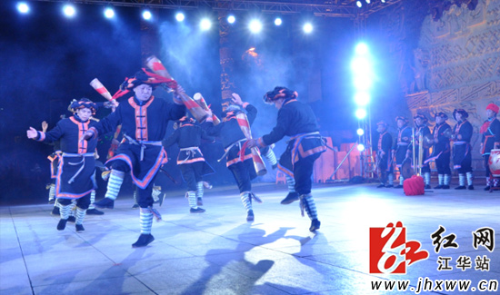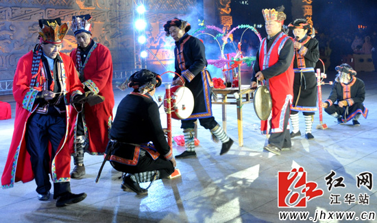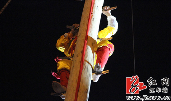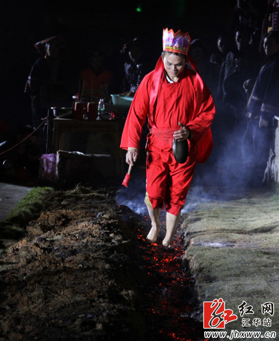 红网江华站11月28日讯(通讯员 于光林)11月26日晚上,在江华瑶族自治县瑶族图腾园广场举行瑶族奏铛文化——瑶族“度戒”文化展示。上刀山,过火海,惊心动魄的场景让人惊叹。晚上七点,“度戒”文化展示正式开始。只见主度师王声英穿着黄色仪服开始做第一场法事(科仪),恭请天神地祇众位神明;尔后,主度法师王声英手操法器,走出内坛,在外坛“文坛”念经作法开天门,七声鸣牛角后开启天门,迎圣排兵,奏《码头意者》,说明开天门的原因,然后送圣上娇回宫,拜塞天门;然后跳具有浓郁的瑶族特色的原始宗教色彩祭祀礼仪的原生态长鼓舞和唱神秘原创祭文瑶歌以祭祀盘王;紧接着第四场挂灯,主度法司王声英三尺六寸红布搭桥让天神地邸降临后,通过进入法坛,谢师之后正式进入上刀山。