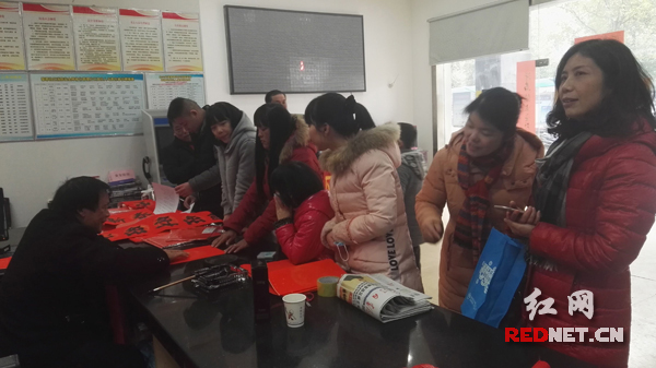 在送春联活动中,小区书法爱好者为居民现场撰写春联,免费赠送。写春联的黄爹是社区3栋的居民,他的书法遒劲有力,她妻子组织腰鼓队助阵,夫唱妇随的表演引来群众一片叫好。