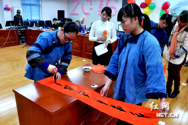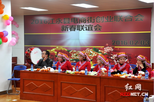 当天下午,江永县电商街云平台二楼会议室张灯结彩,76名电商人员欢聚一堂,载歌载舞,喜迎新春佳节。《爱拼才会赢》《感恩的心》等一首首耳熟能详的歌曲,唱出了电商从业人员敢拼敢闯的心声;千家峒瑶族乡刘家庄电商瑶妹们用自创的电商快板,说出了瑶家妹子与电商结缘返乡创业的故事;女书传人蒲丽娟现场挥毫泼墨,用女书文字书写春联“玉燕迎春春永驻,金猴降福福常存”,祝福电商街的明天更加美好。