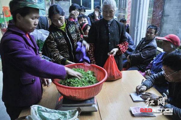 茶叶加工厂工作人员正在收购茶叶。