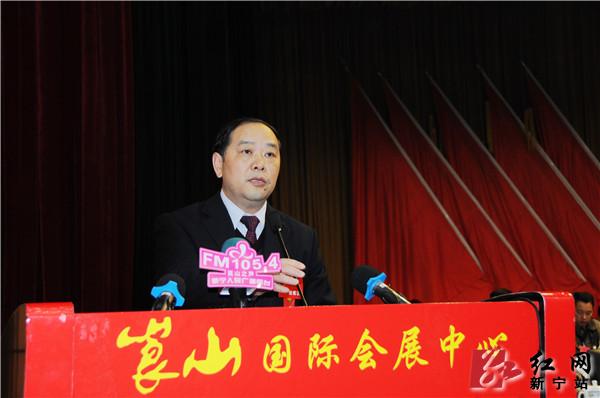 新宁县委副书记、县长谭精益作政府工作报告。(杨坚 李开祥 摄)
