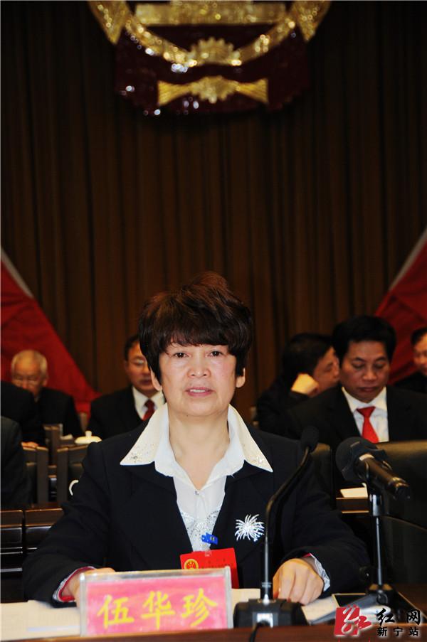 新宁县人大常委会主任伍华珍主持会议。(杨坚 李开祥 摄)