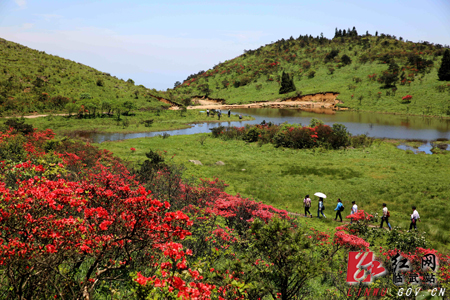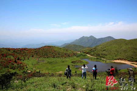红网临武站5月12日讯(通讯员 周卫民)5月11日,湖南省临武县西瑶绿谷国家森林公园天鹅潭景区摄影爱好者正在拍摄杜鹃盛开美景。每年4月中上旬,该景区海拔近1500米高峰上野生高山杜鹃、天然湿地、碧草蓝天构成了一幅幅雄峻而秀美自然风光图,被摄影爱好者称为难得一见的一片净土。