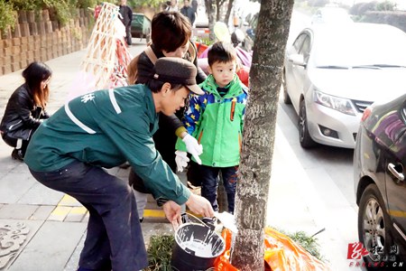 参加活动的孩子提着分发的小桶和刷子在家长带领下来到自己的“责任区域”,给树池草皮盖上报纸或纸板防溅洒,仔仔细细按着要领开始刷白,不怕脏、不怕累,全然不顾刷白药剂沾到在衣服和手上,每每完成一棵,他们都格外高兴。此外,市民可以通过建立的网上互动平台,认领城市中的树木,加强互动。家长对此次活动也是赞赏有加:“以前在路上行走,都是匆匆而过,并没有过多关注这些城市的树,但是这次活动不仅可以让小孩亲近植物、学到知识,同时也是我们跟城市里的绿色多了一个连接的纽带。”