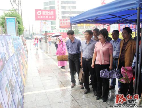 市委副书记、市长谢学龙(右三),市委常委、常务副市长吕余庚(左二),副市长王良(右一)等领导在宣传点观看各单位宣传展板。