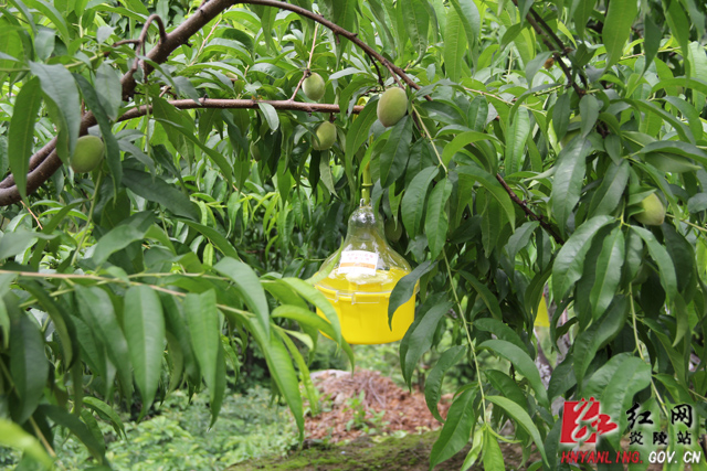 在黄桃树挂好的诱捕器