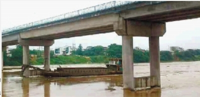 涟水大桥是湘潭市区砂子岭通往湘潭县的重要通道。今日上午11时许,记者赶到现场,站在岸边远远望去,只见涟水河水流湍急。一艘运砂船正搁置在涟水大桥的一处桥墩上。大桥已被临时封闭,只许人员通行。