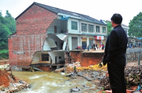 三兄弟的家均位于贺家桥镇水口山村水口组,其中周世平、周世光两家并排排列,相距约20米(中间是空地),一条近10米宽的河流从两家门前流过。14日的暴雨中,这条河河水漫堤一米多,将两家之间的空地冲出一条沟壑,致使两家楼房出现垮塌,墙体现出大窟窿。
