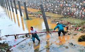 5月16日,醴陵市贺家桥镇水口山村,村民在河内清理垃圾。本报记者周健摄