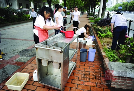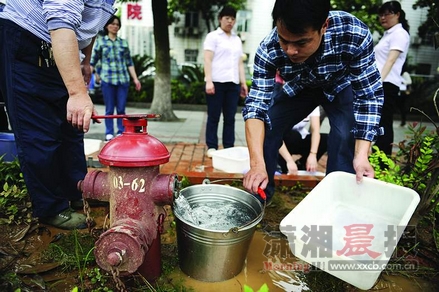 红网长沙5月18日讯(潇湘晨报记者 覃剑 图/记者 杨旭)5月17日上午11点多,长沙五一大道的一个消防栓旁,一男子手握扳手,组织排队的人接水。接水的人大多穿着白衬衫、黑长裤,服装统一。他们都是附近新华楼餐厅的员工,因为水电被停,他们不得不从消防栓取水。