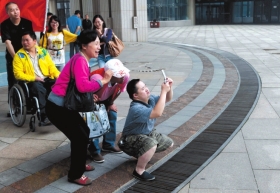 5月19日,爱心人士带着行动不方便的残疾朋友游玩神农城。本报记者邓昊摄
