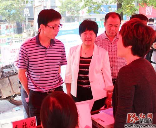 涟源市委常委、宣传部长肖更新(左一),市人大常委会副主任童春秀(左二)到科普广场宣传活动现场观看指导。(张卓、肖涛摄)