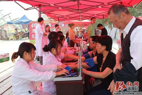 在医院的义诊台前,前来问诊和做血压测试的群众络绎不绝。