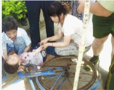 本报5月28日讯 今日上午8点半左右,衡阳市茶山一名6岁左右的小孩脖子被单车踏板钢筋贯穿,珠晖消防中队赶到现场实施了紧急救援。
