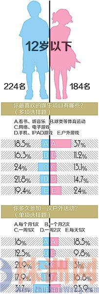 记者随机选择了天元区、荷塘区3所学校,每个学校随机抽取高、中、低年级各一个班学生,进行了“12岁以下儿童户外活动”问卷调查。其中,12岁以下男孩有224名,女孩有184名。