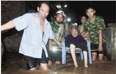 5月29日晚,嘉禾县消防官兵与市民在转移94岁的老人。当天傍晚,该县降下暴雨,县城老城区一带水流成河,众多房屋进水,数百居民被围困。得知情况后,消防官兵和珠泉镇干部迅速前往救援。至晚上9时30分,300多名被困群众均被转移到安全地带。■通讯员 黄春涛 陈飞 摄影报道