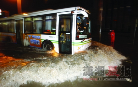 5月8日晚,长沙中山路,暴雨造成路面积水严重,公交车像船一般趟水而过。图/记者华剑