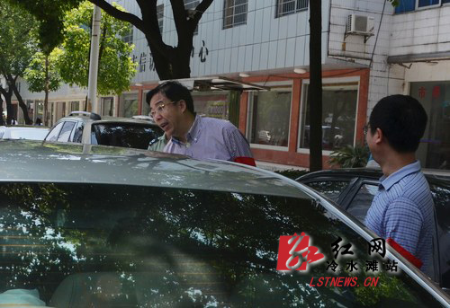 冷水滩区委副书记、区长何冲龙劝导私家车司机文明停靠。