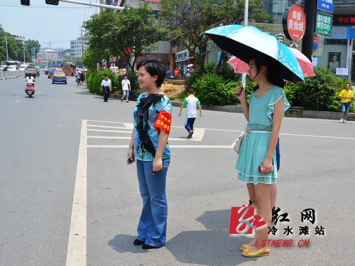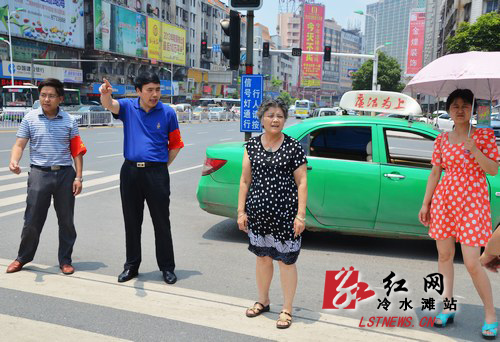 行人在区委常委、统战部长副区长陈莉劝导下有序过马路。