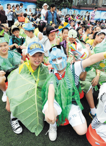 昨日,芙蓉区火星小学百名晚报校园记者和千名同学一起,身穿用报纸、塑料和彩纸等做成的“衣服”,进行环保时装秀,以庆祝自己的节日。 李锋 余志雄 摄影报道