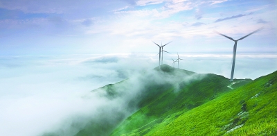 6月2日,临武县三十六湾风电场云海翻腾,绿意盎然。三十六湾曾是矿产开采区,污染严重。2006年,该县封闭矿区,利用自然资源,引进总投资5亿元、总装机容量4.8万千瓦的风力发电项目落户,并在山坡上植草绿化,使当年的重污染区变成了生态家园。