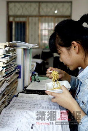 6月3日,长沙市岳麓实验中学,高三女学生一边吃着中饭,一边看高考复习资料。 图/记者殷建军
