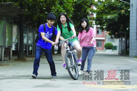 5月26日,长沙市一中的秦琛(中)在好友的帮助下学骑自行车。她想骑自行车熟悉美国的大学校园。