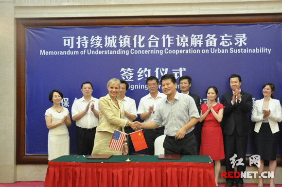 (长沙市副市长姚英杰(前排右),与美国保尔森中心副主席戴青丽(DehorahLehr)(前排右)签署可持续城镇化合作备忘录。)