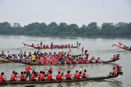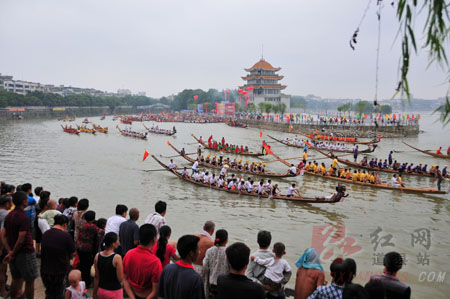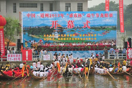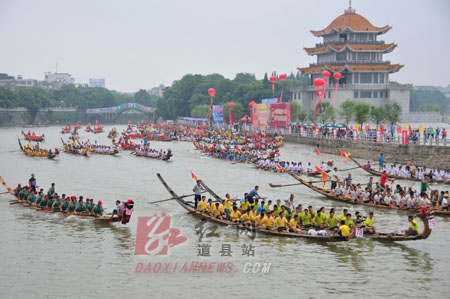 红网道县站6月9日讯(通讯员 盘林)6月9日,道县端午节龙船赛开赛,共有146只龙船、4000多名运动员,在潇水河上斩波激浪,演绎此一民间文化精髓。据悉,2002年,道县被省人民政府授予“龙舟之乡”的称号;2006年,“道州龙船赛”被列入“湖南省首届非物质文化遗产代表名录”;目前,已申报全国非物质文化遗产。该县每年的龙船赛,吸引了来自省内各地以及广东、广西、上海、湖北等省20余万人次前往观看。