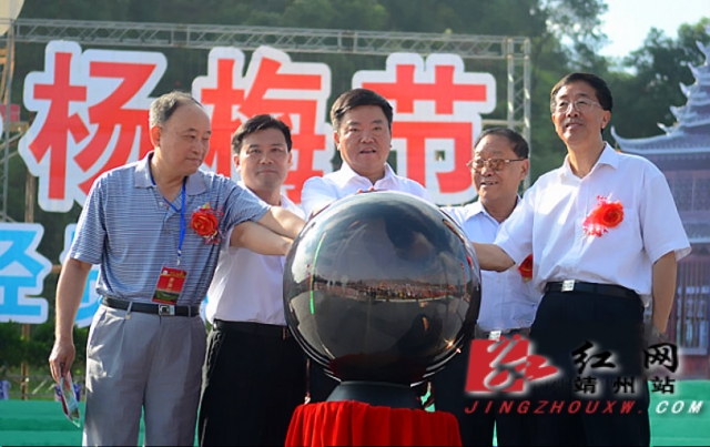 国务院研究室原党组成员、全国政策科学研究会会长武树帜同志宣布“金大地”2013中国·靖州·杨梅节暨湘黔桂边界区域投资经贸博览会正式开幕。中央组织部原副部级巡视专员李德亮,国务院研究室原党组成员、全国政策科学研究会会长武树帜,国家林业局原总工程师、林产品国际贸易研究中心名誉主任姚昌恬,怀化市委书记张自银,靖州县委书记钦代寿触摸水晶球启动杨梅节。