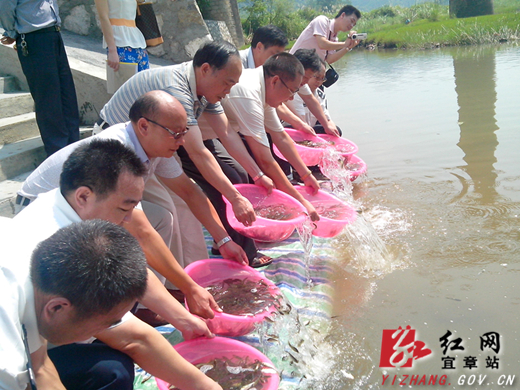 红网宜章站6月20日讯(通讯员 曾小娟 钟国权 曾超) 6月20日,宜章县在梅田镇黄石村码头举行珠江流域宜章武水河段人工增殖放流活动,共投放各种规格的草鱼、鲤鱼、鲫鱼等鱼苗100多万尾。