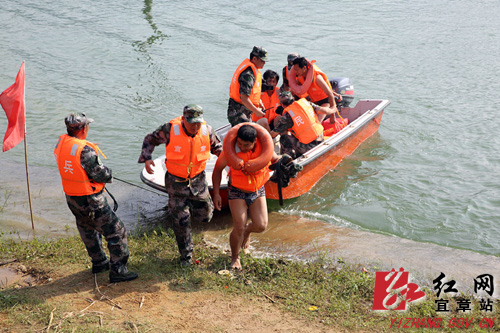 红网宜章站6月20日讯(分站记者 李茁 通讯员 邓忠明)“一组注意,A区有两名群众被洪水围困,命令你们立即赶赴救援!”话音刚落,一组水上救援突击队迅速登上冲锋舟,飞驰驶向事发地点,只见一名突击队员纵身入水,迅速将落水群众托上冲锋舟,“遇险群众”成功获救。这是6月19日上午,宜章县民兵舟桥分队开展水上救援演练的一个场景。
