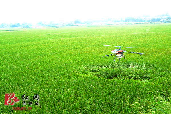红网华容站6月21日讯(分站记者 严非平)6月20日,华容县鲇鱼须镇普贤村6组,两架翅展2米多的无人直升机静静地守候在水稻田头,飞机操控员不停地调试着遥控器,随着螺旋桨越转越快,一架无人直升机腾空而起,螺旋桨旋起的气流将水稻稻株吹开,雾状的液体不断从飞机下方的5个喷嘴均匀喷出……