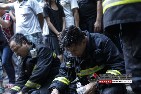 (现场消防官兵组织灭火,火势扑灭后一名消防员在路边休息。图/潇湘晨报滚动新闻记者 赵赫廷)